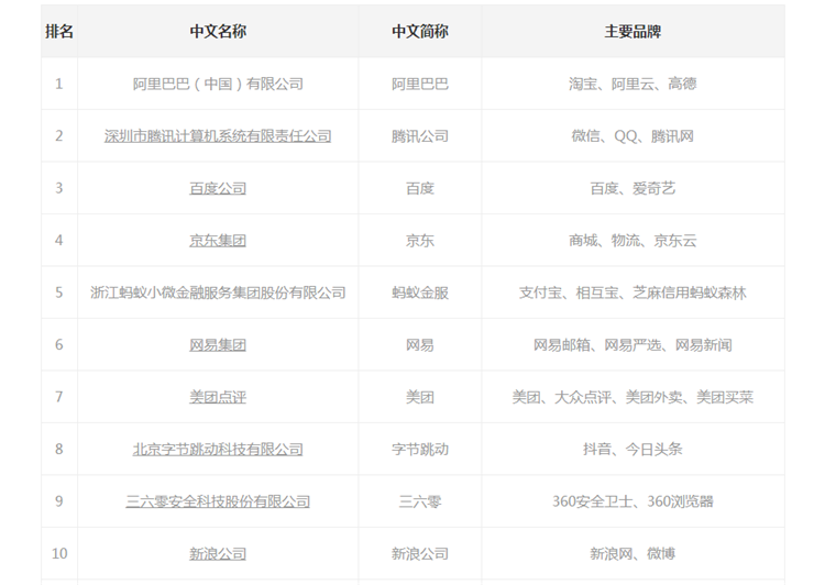 中国互联网协会、工业和信息化部网络安全产业发展中心发布了2019年中国互联网企业10强榜单,阿里巴巴、腾讯、百度、京东、网易、美团点评、新浪等企业位列榜单。